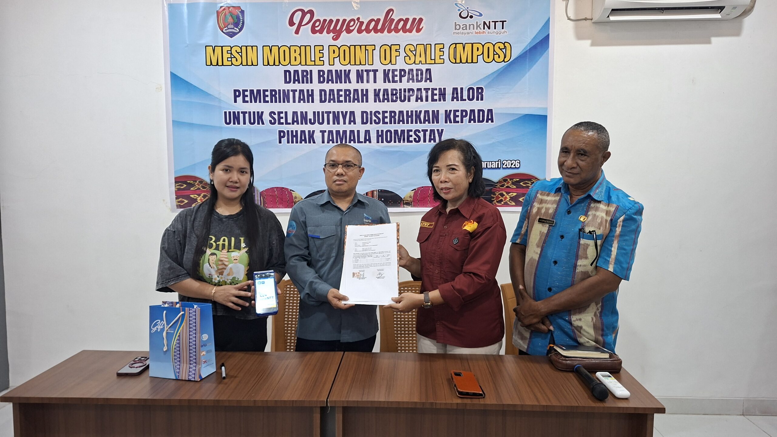 KALABAHI,RADARPANTAR.com-Terobosan baru menuju modernisasi sektor jasa di bidang perhotelan dan optimalisasi Pendapatan Asli Daerah (PAD) di Kabupaten Alor resmi dimulai. Jumat, 27 Februari 2026 akhir pekan silam, Bank NTT Cabang Kalabahi melalui Badan Pendapatan Daerah (Bapenda) Kabupaten Alor resmi menyerahkan mesin Mobile Point of Sale (MPOS) kepada pengelola Tamala Homestay.